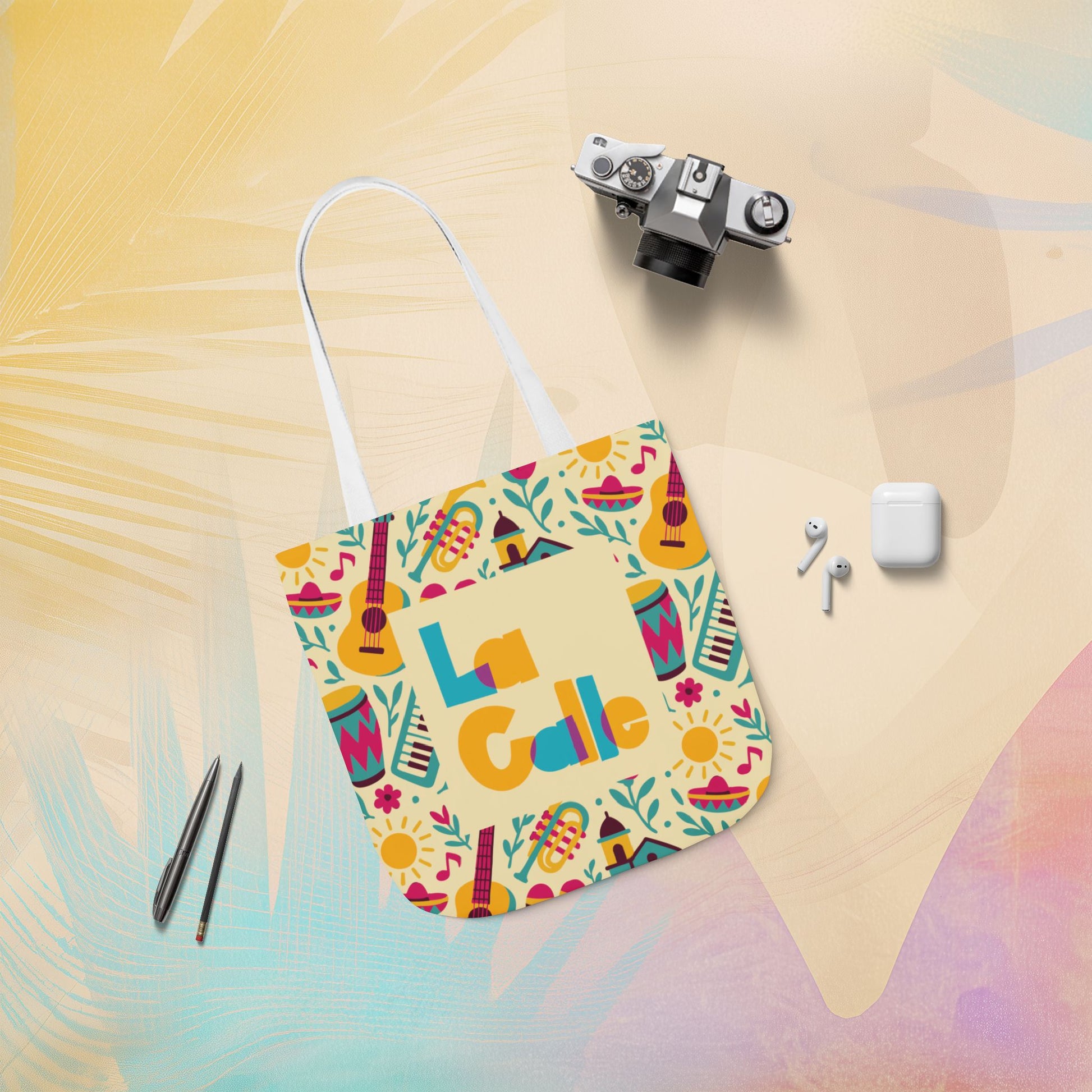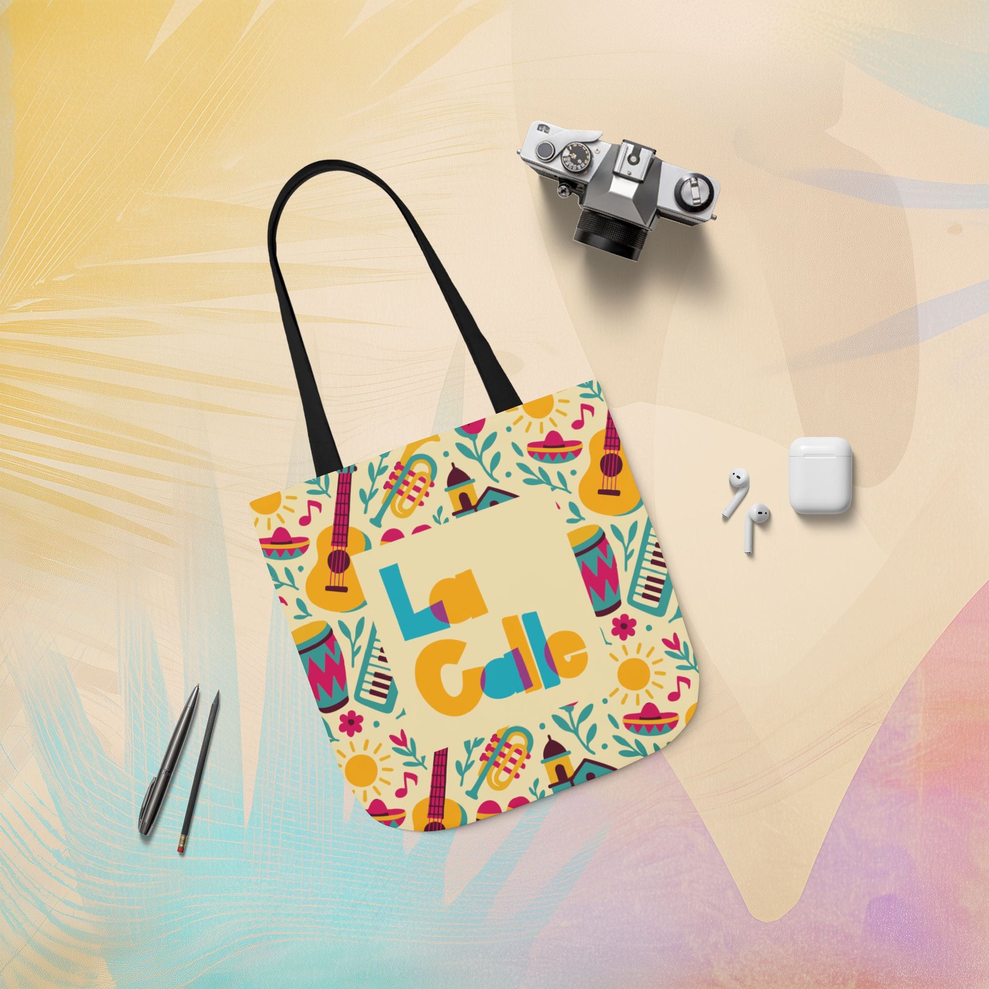 Celebrate sunshine, rhythm, and community with the Calle Fiesta Canvas Tote Bag. Bursting with Latin flavor and cultural pride, this vibrant all-over print features guitars, congas, sombreros, flowers, and more — channeling the festive energy of the street. Whether you’re headed to a music festival, beach day, or casual outing, this bag offers comfort, space, and undeniable style.